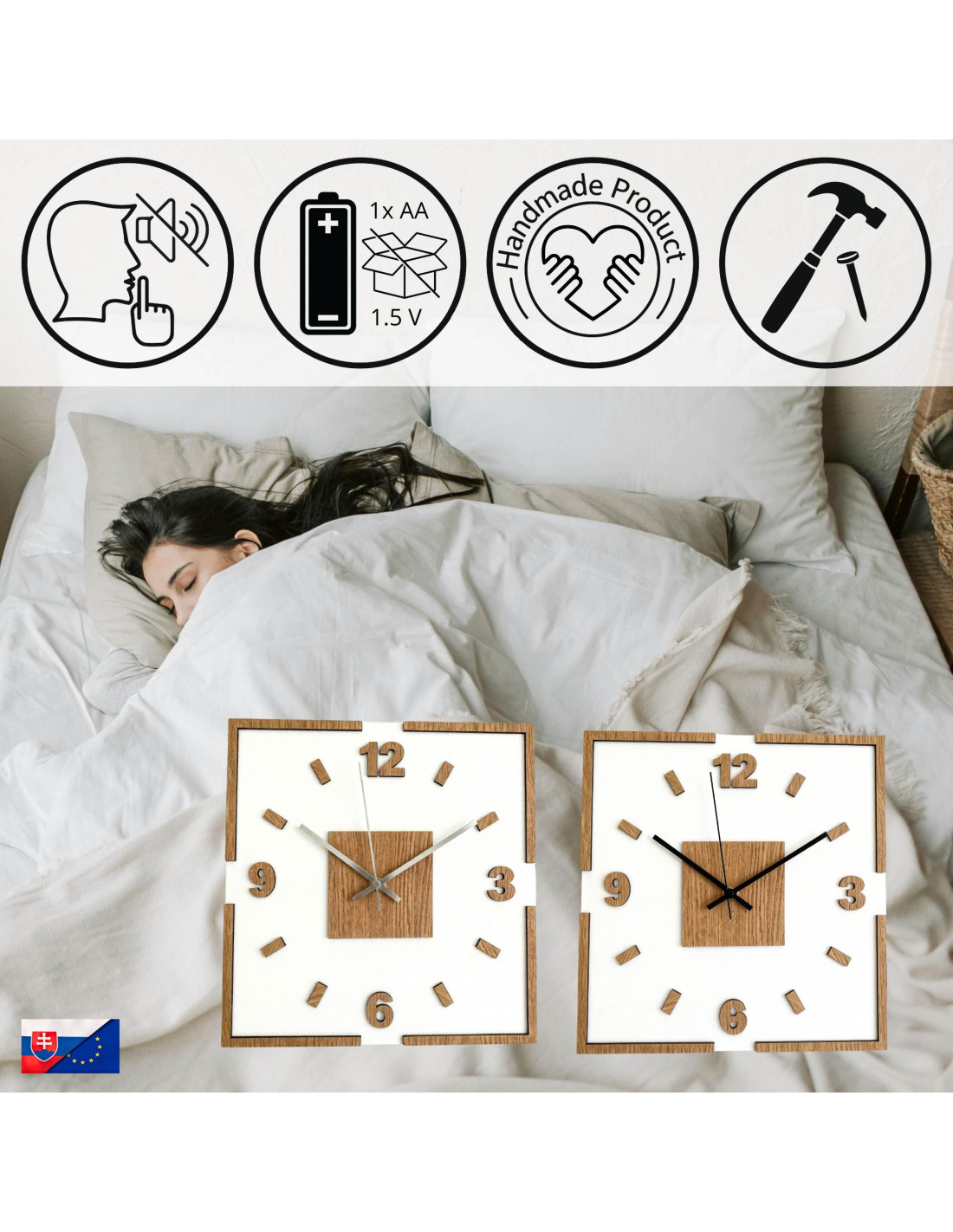 Az óra közepét egy tölgyfa négyzet emeli ki, amelyből fekete vagy ezüst mutatók emelkednek ki a tökéletes kontraszt és olvashatóság érdekében.