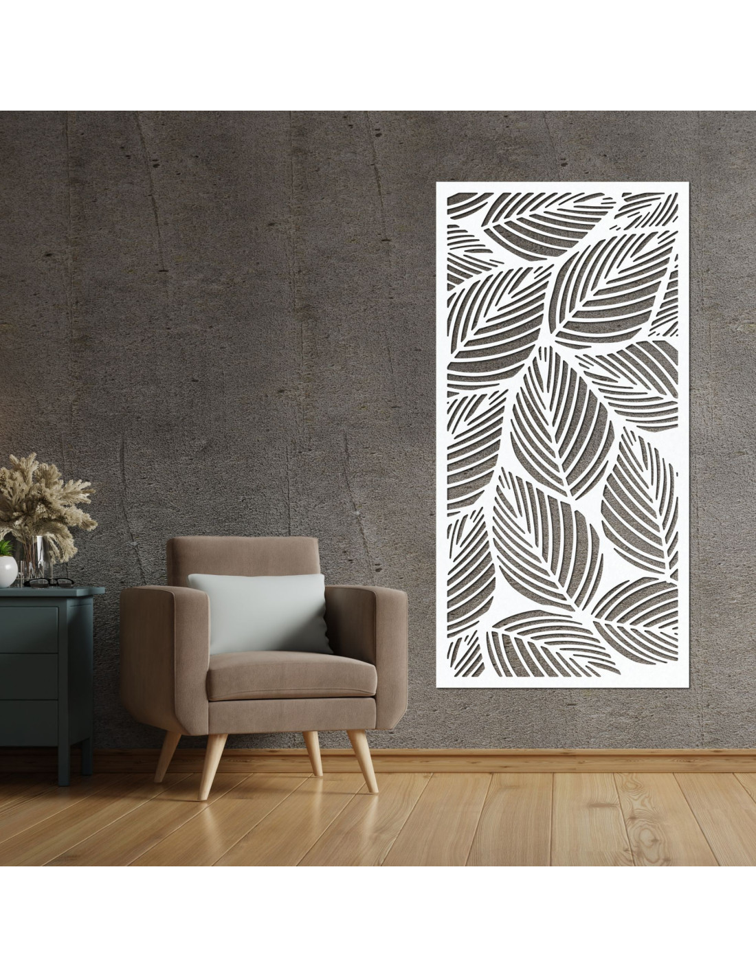 Egy levélmotívumos dizájnfestmény természetközeli hangulatot és könnyedséget visz a belső térbe.