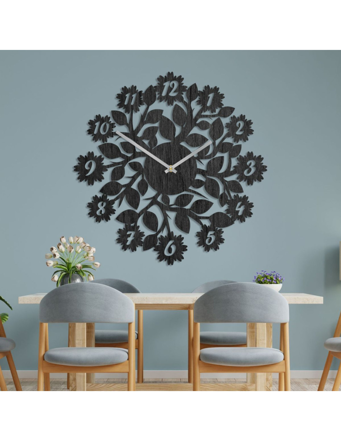 Elegáns, csendes működésű, fából készült óra finom virágmotívummal. Természetes dizájn, amely modern és rusztikus enteriőrökbe egyaránt illik.
