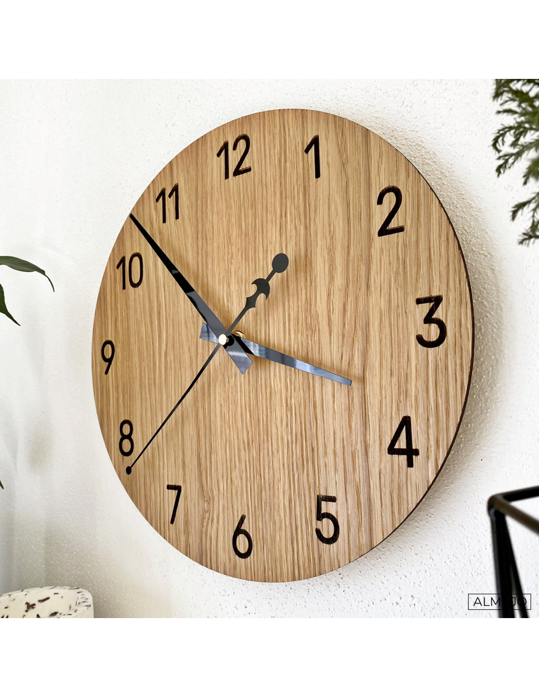 - Természetes és elegáns dizájn : A tölgyfa és a fekete fém mutatók minimalista kombinációja bármilyen modern térbe illik.