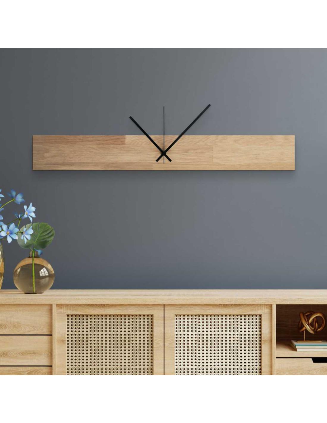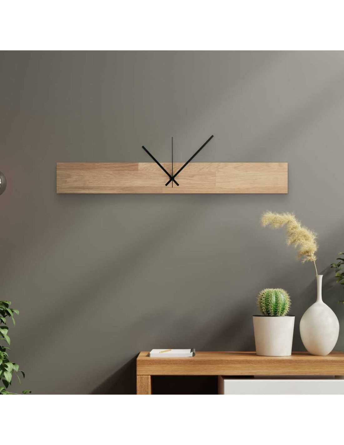 A minimalista stílusú fa faliórák harmóniát és ízlést kölcsönöznek a térnek.