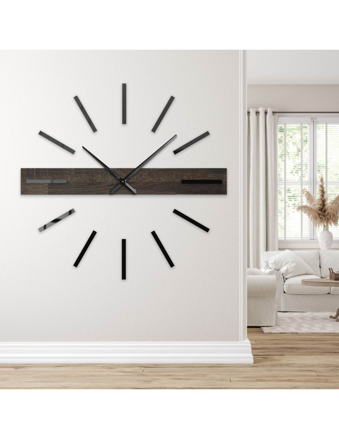 Természetes és elegáns dizájn – a tölgyfa, a fényes fekete plexi számok és a fém mutatók kombinációja modern és időtlen megjelenést kölcsönöz.