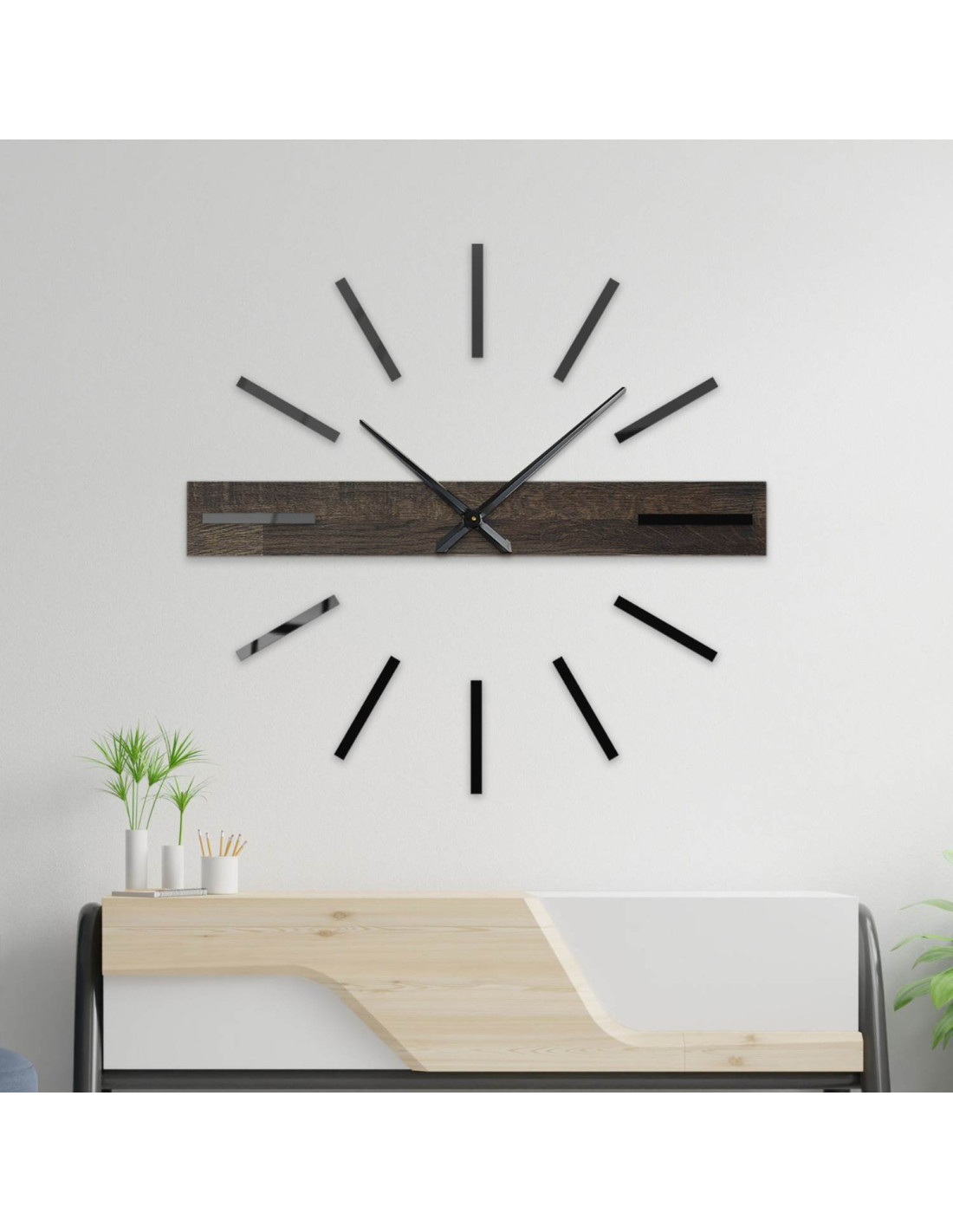 • 1. lehetőség - fa / óra méretei: 80 × 10 cm (31,5 × 3,9 hüvelyk), súly 1 kg (2,2 font), óra átmérője 80 cm (31,5 hüvelyk)