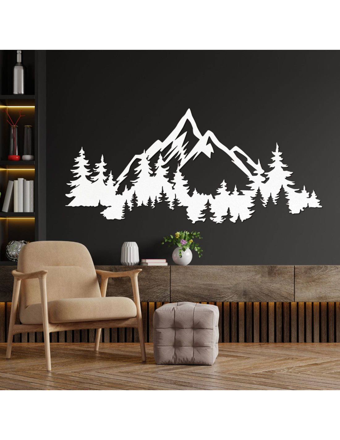 Minimalista 3D-s kép hegyekről és erdőről fekete HDF lapból a kanapé felett