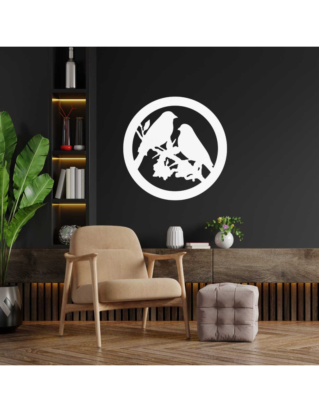 Egy madársziluetttel, kör alakú kerettel és természetes motívummal ellátott, fából készült faldekoráció békét és harmóniát visz a belső térbe.
