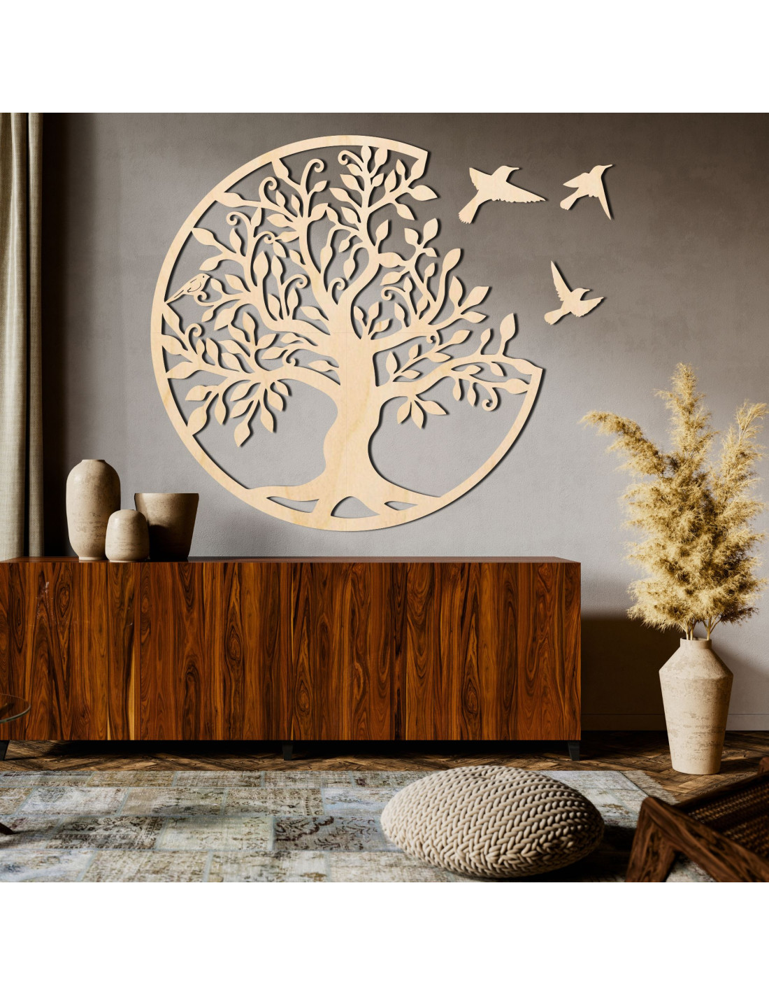 A három jobbra repülő madárral díszített, fából készült életfa egy elegáns faldekoráció, amely stílust és harmóniát visz otthonába.