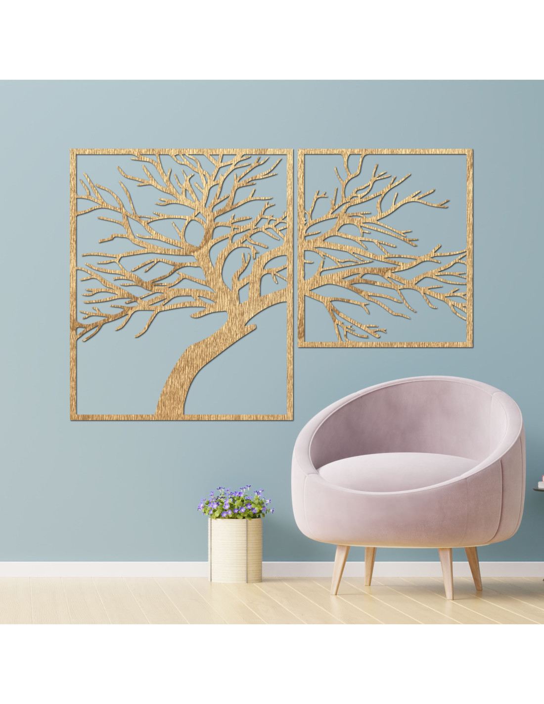 Kétrészes, fából készült festmény, Az élet fája - egy egyedi műalkotás, amely ötvözi a természetes szépséget, az egyensúlyt és a modern dizájnt.