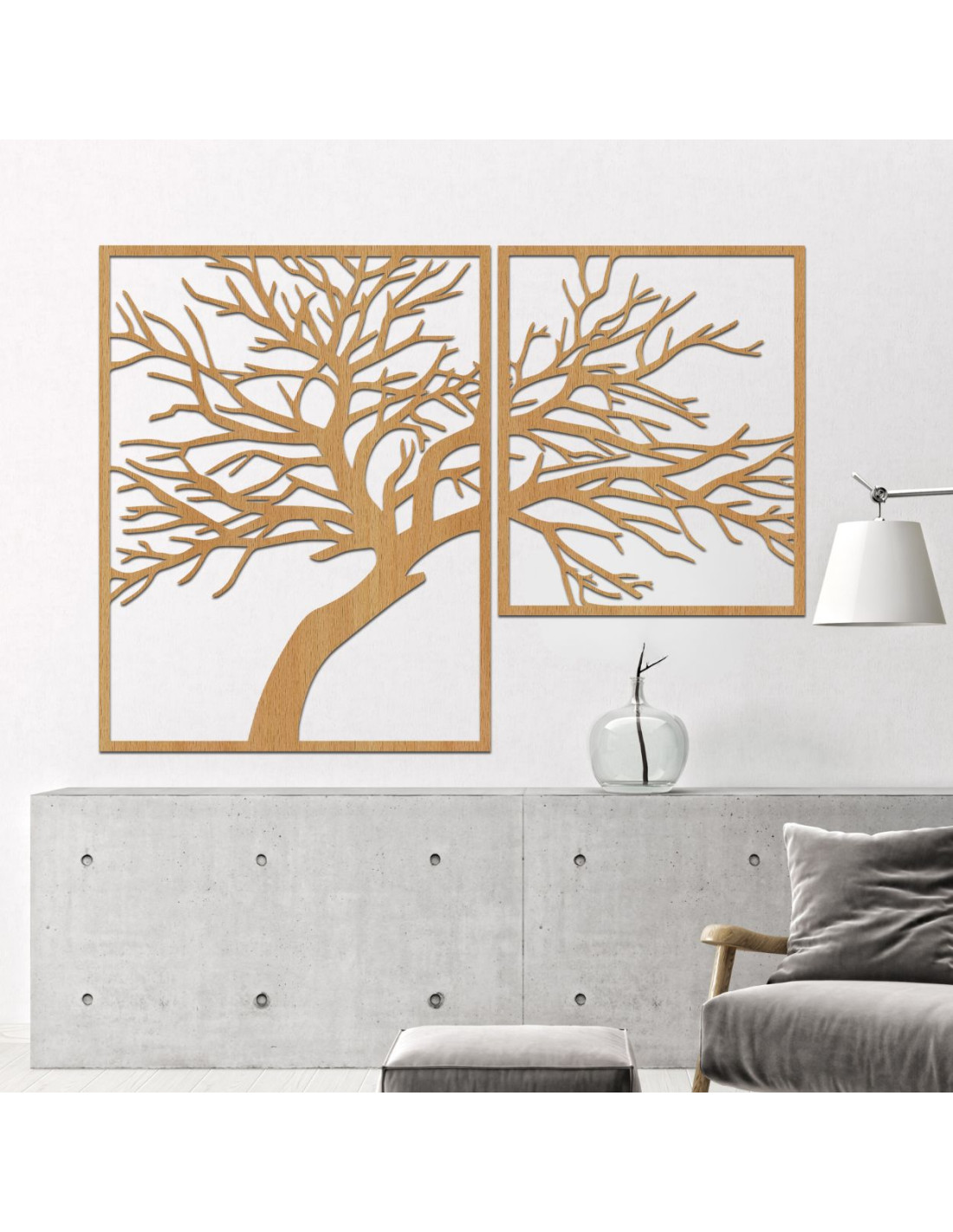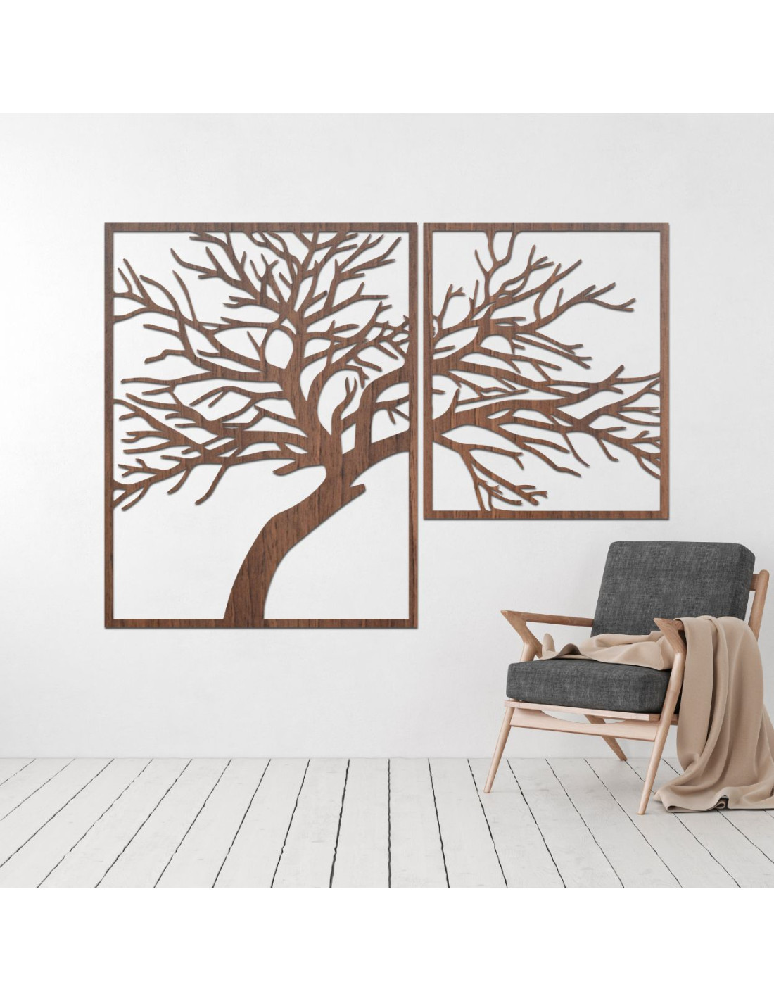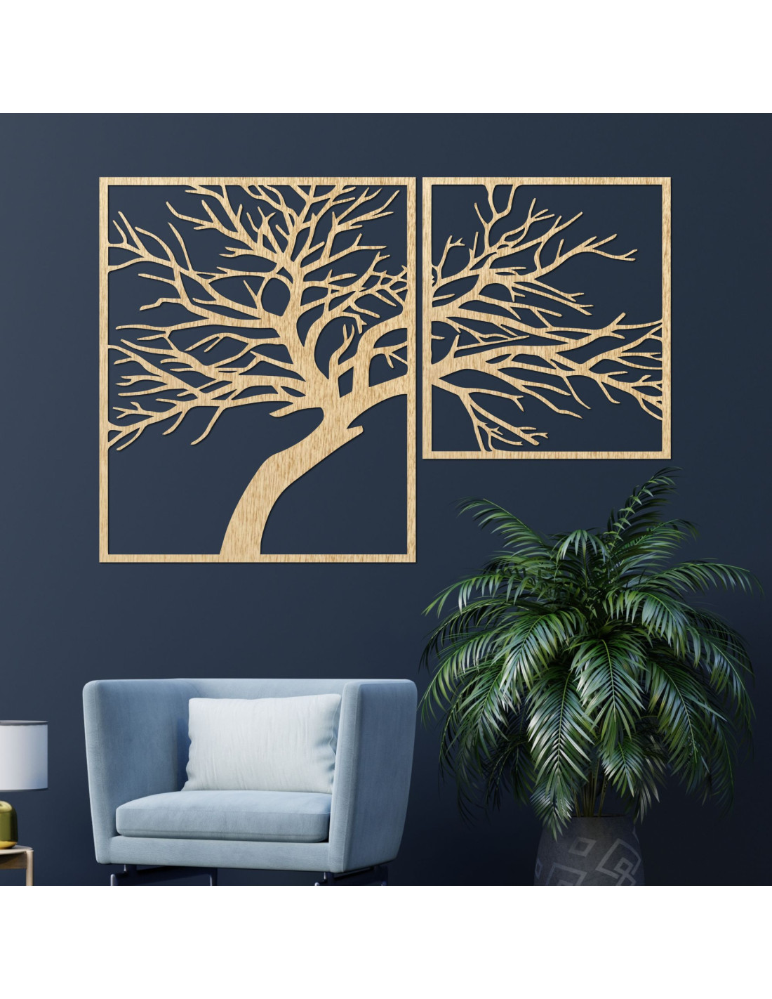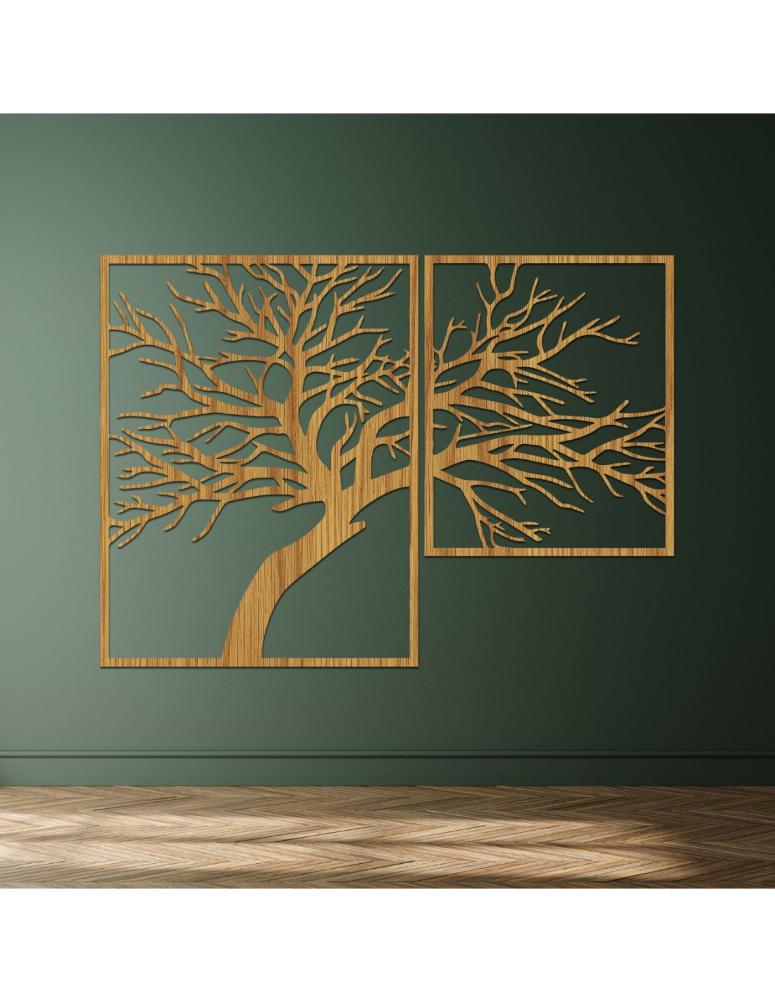 Kétrészes, fából készült festmény, Az élet fája - egy egyedi műalkotás, amely ötvözi a természetes szépséget, az egyensúlyt és a modern dizájnt.