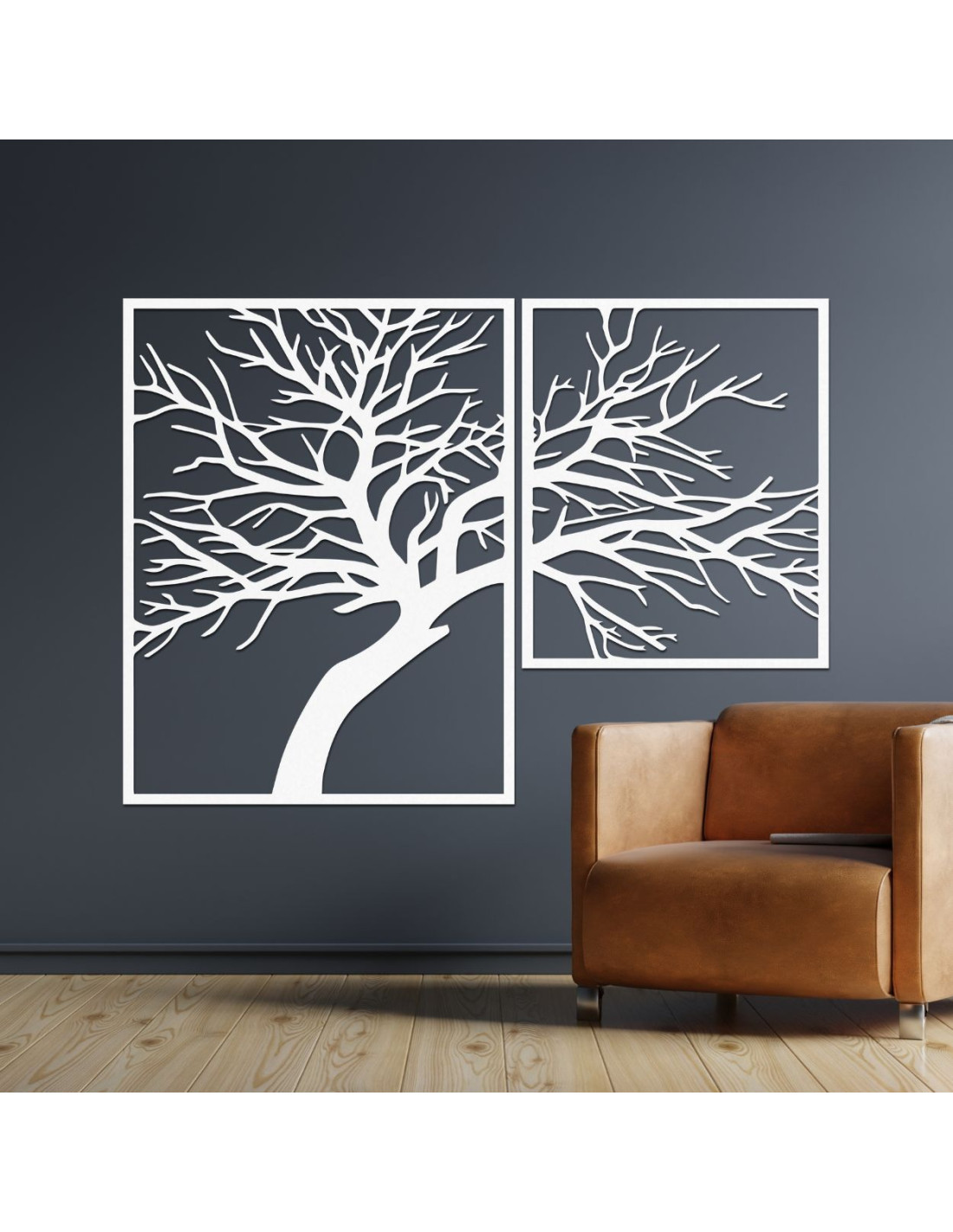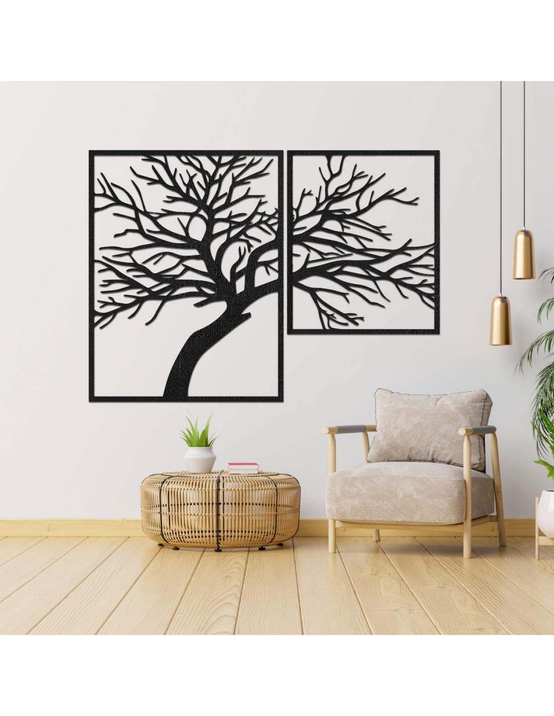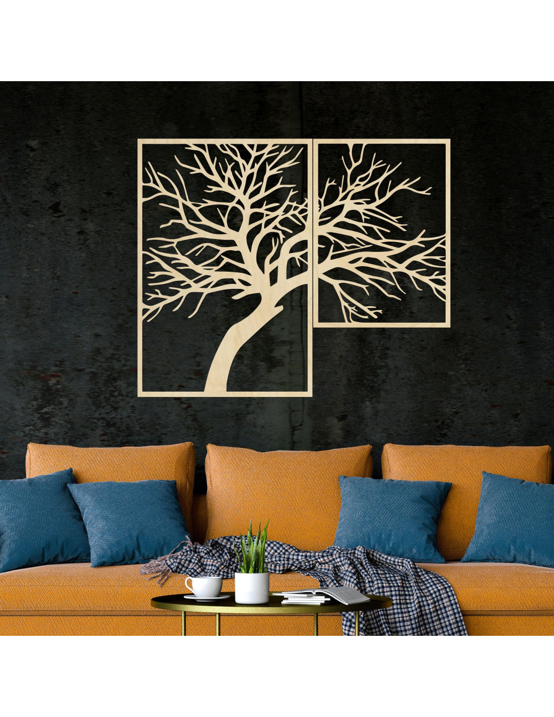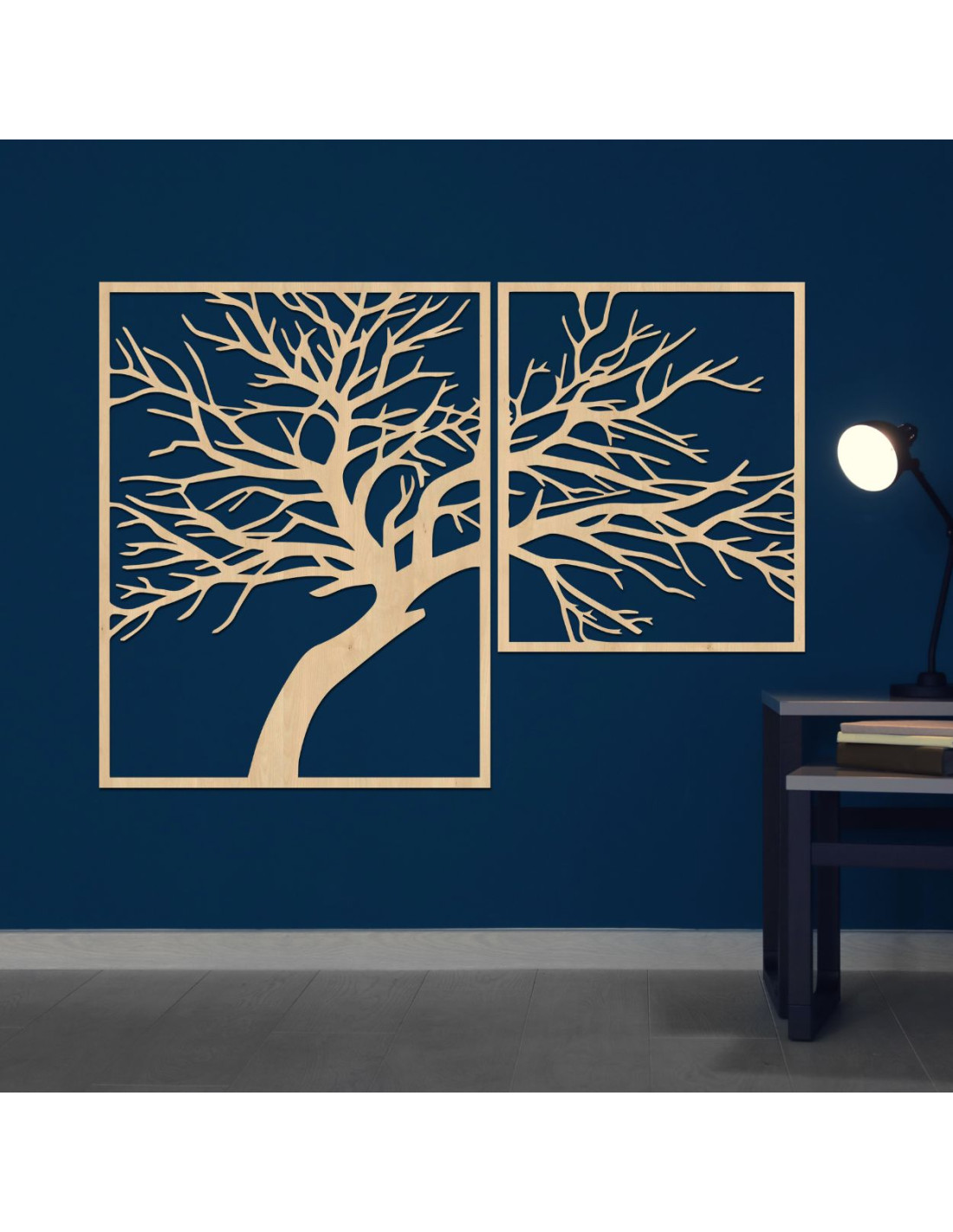 Kétrészes, fából készült festmény, Az élet fája - egy egyedi műalkotás, amely ötvözi a természetes szépséget, az egyensúlyt és a modern dizájnt.