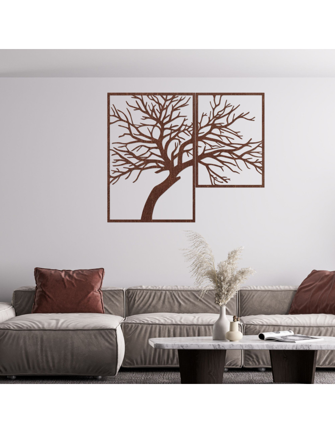 Kétrészes, fából készült festmény, Az élet fája - egy egyedi műalkotás, amely ötvözi a természetes szépséget, az egyensúlyt és a modern dizájnt.