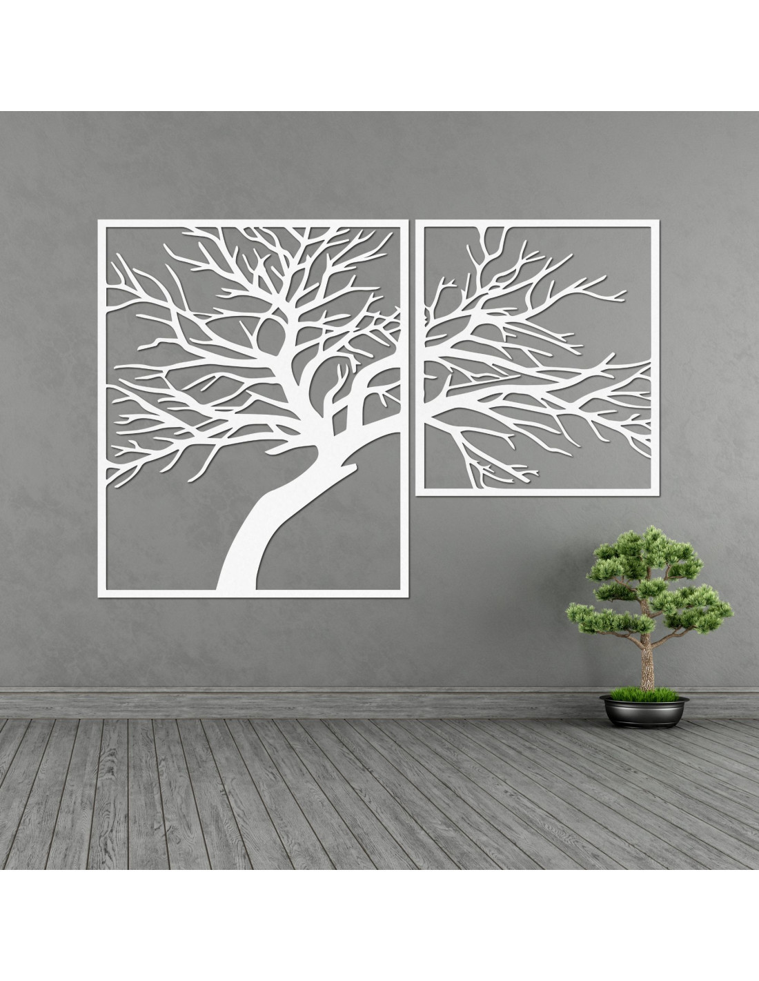 Kétrészes, fából készült festmény, Az élet fája - egy egyedi műalkotás, amely ötvözi a természetes szépséget, az egyensúlyt és a modern dizájnt.