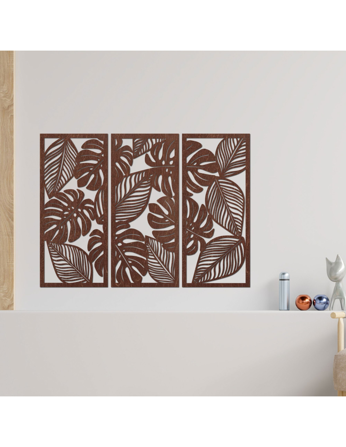 Modern faldekoráció: három panel monstera levelek kivágásaival.