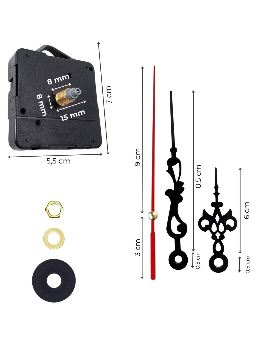 - A készlet tartalma: gumi alátét, fém alátét, középső anya, KVARC szerkezet, óra-, perc- és másodpercmutató